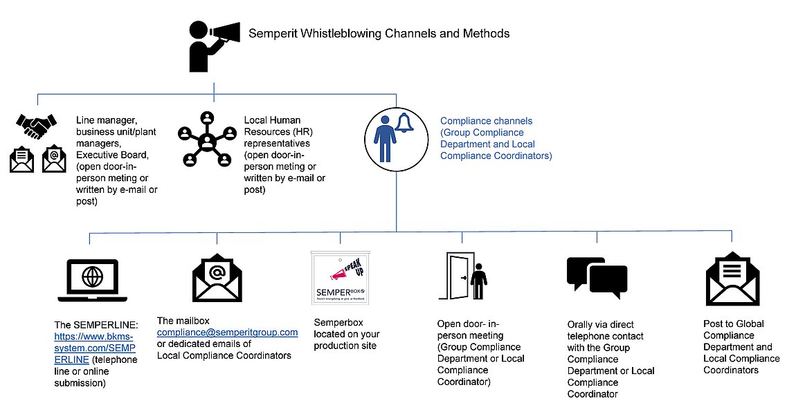 We encourage our employees to report concerns internally as soon as they arise. As an employee, you should report any possible illegal, unethical, or improper violations to your supervisor, managers, Human Resources, or the Compliance team. If you can't address compliance concerns directly or are a customer, agent, supplier, business partner, or stakeholder, kindly contact us by email (compliance@semperitgroup.com). You may also use the secure whistleblowing platform called "SemperLine". This dedicated communication platform is free of charge and available to any stakeholder anywhere in the world 24 hours a day, seven days a week. It is operated by an independent third-party, EQS, thus ensuring your information is handled securely and confidentially.