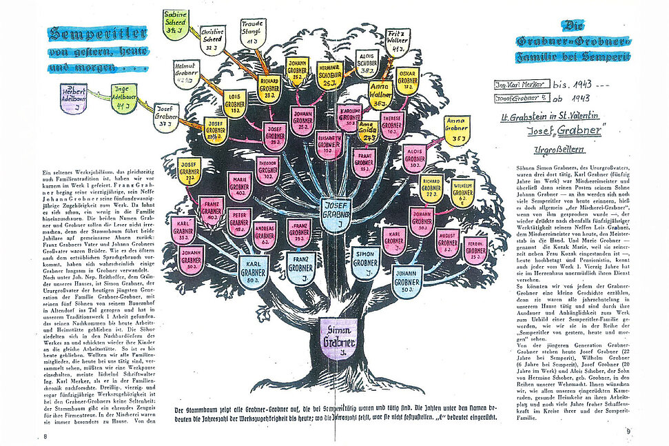 „Ehrlich gesagt wurde mir das in die Wiege gelegt“, sagt Herbert Adelbauer auf die Frage warum es ihn ebenso wie seinen Onkel zu Semperit gezogen hat. Betrachtet man den Familienstammbaum von Herbert Adelbauer in einer alten Semperit-Zeitung (siehe Abbildung) wird das überdeutlich. Dort heißt es: „Noch unter Johann Nepomuk Reithoffer ist Simon Grabner, der Ururgroßvater der heutigen jüngsten Generation der Familie Grabner-Grobner, mit seinen fünf Söhnen von seinem Bauernhof in Altendorf ins Tal gezogen und hat in unserem Traditionswerk 1 Arbeit gefunden, das seinen Nachkommen bis heute Arbeits- und Heimstätte geblieben ist. Die Söhne siedelten sich in den Nachbardörfern des Werkes an und schickten wieder ihre Kinder an die gleiche Arbeitsstätte. Sie sind durch ihre Ausdauer und Anhänglichkeit zum Werk zum Urbild einer Semperitler-Familie geworden.“ Und so ist es bis heute geblieben.